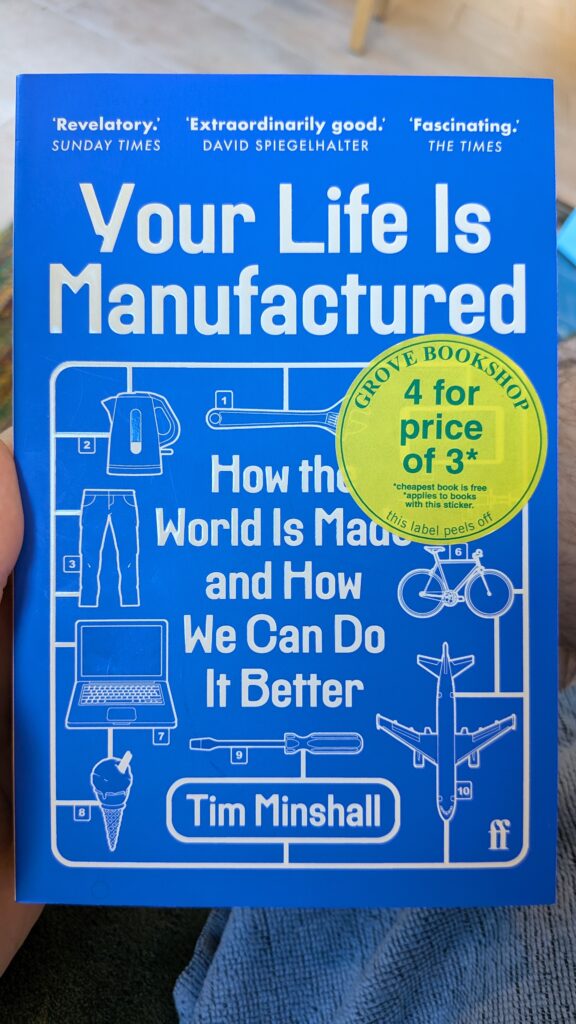 The author Tim Minshall favours a very personal and light-hearted style, which does make for a fun read although I would prefer a slightly lower ratio of puns (perhaps I’m just getting grumpier with age). The content flows along nicely and does open your eyes to the wonders and evils of modern manufacturing… but I was expecting maybe more mind-blowing facts about scale, complexity etc. Material World really delivered on this, packed so full of insane descriptions that I couldn’t help feel a little underwhelmed with the examples here.